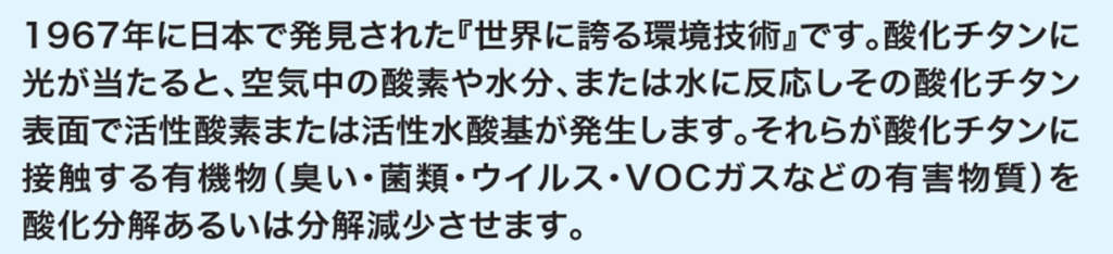 世界最小レベル2ナノの酸化チタンが、室内の微弱な蛍光灯や一瞬の光でも効果を発揮。