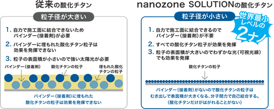 世界最小レベル2ナノの酸化チタンと素材が分子間結合することにより、劣化することもなく、永続的に効果が持続する。